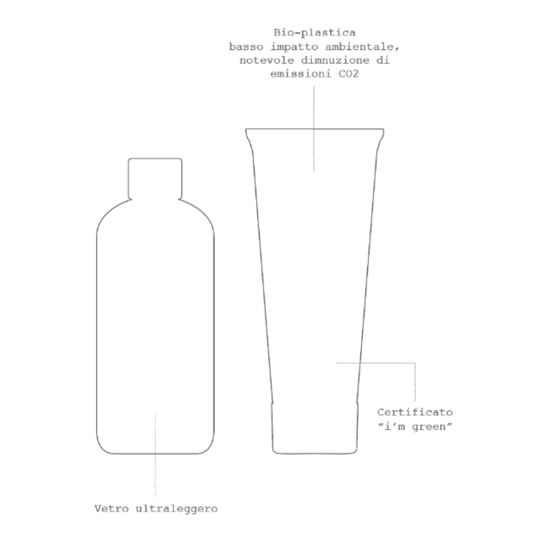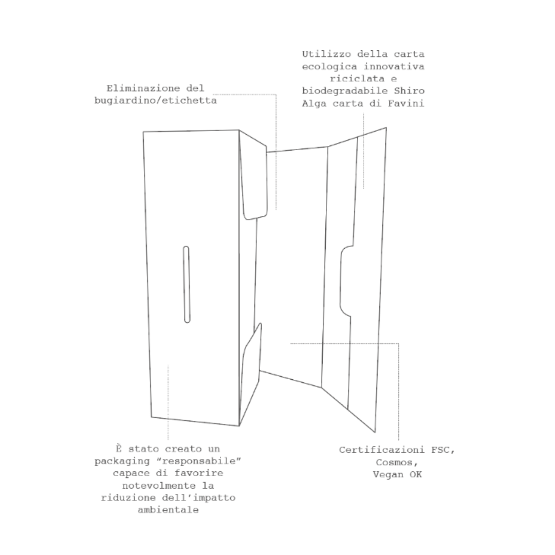 De dozen zijn gemaakt van Shiro alga ecologisch, biologisch afbreekbaar papier, dat volgens een innovatief proces wordt gerecycled. Dit papier is vervaardigd met algenbloei geoogst uit de lagune van Venetië en is ook FSC-gecertificeerd. Bovendien worden er geen vernis- of lijmpunten gebruikt bij de vervaardiging van onze dozen, is de bijsluiter weggelaten en is de verpakking zelf omgevormd tot een volledig beschrijfbaar oppervlak dat alle nodige informatie verschaft.